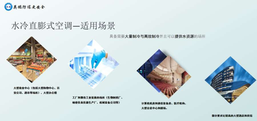 (3)使用场景:具备需要大量与高效制冷并且可以提供水资源的场所;诸如大型商业中心(包括大型购物中心、百货公司、超市等场所)、大型办公楼的使用、工厂和拥有工业设施的场所(生物制药厂、精密仪表仪器生产厂、机械设备公司等)、计算机机房和通信设备房、医疗机构、大型会议中心和剧场、部分要求比较高的大型酒店和宾馆。