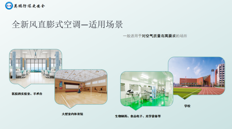 (3)使用场景:作为工业用的全新风直膨式空调,一般适用于对空气质量有高要求的场所,比如医院的实验室、手术台、大型室内体育馆、大型建筑和商场、学校、生物制药、食品电子、光学设备等行业场景。